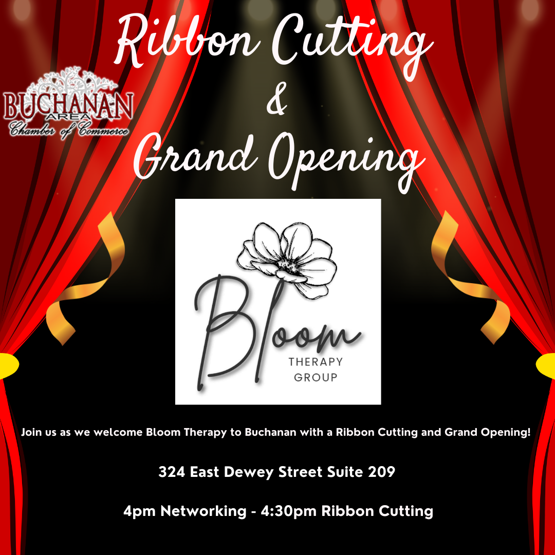 In collaboration with the Buchanan Area Chamber of Commerce , Bloom will hold a ribbon-cutting in the lobby of Building 324’s north entrance at 4pm on Thursday, December 11th. All are welcome to attend. Bloom therapy is located at 324 East Dewey St, Suite 209 in Buchanan, MI.